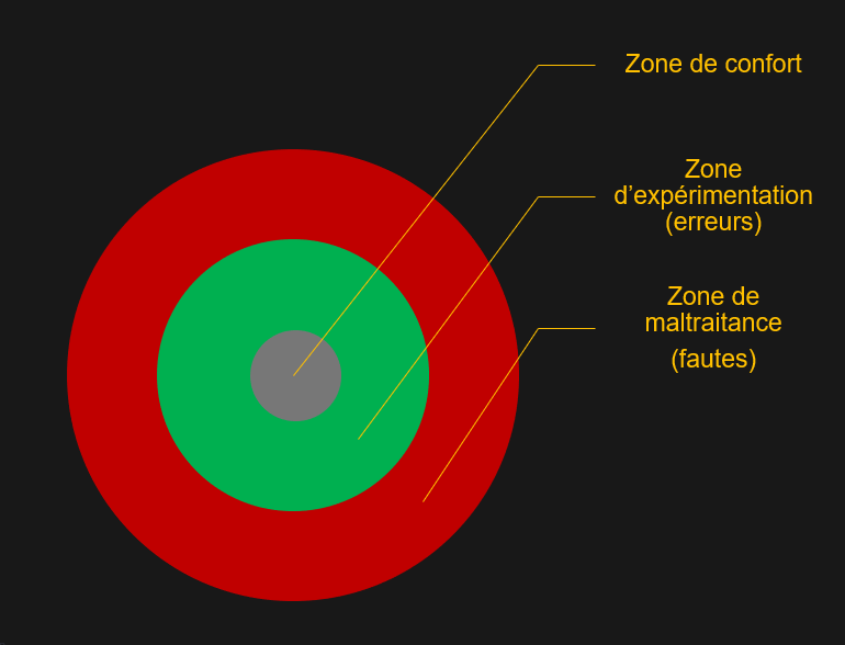 Il faut dans tous les cas éviter la zone de maltraitance, inutile de développer ce point, je l’ai fait dans d’autres articles ou dans le livre Oui et alors. Les improvisat·eur·rice·s doivent se situer dans la zone de jeu, qui est à cheval entre la zone de confort et la zone d’expérimentation.